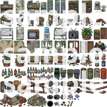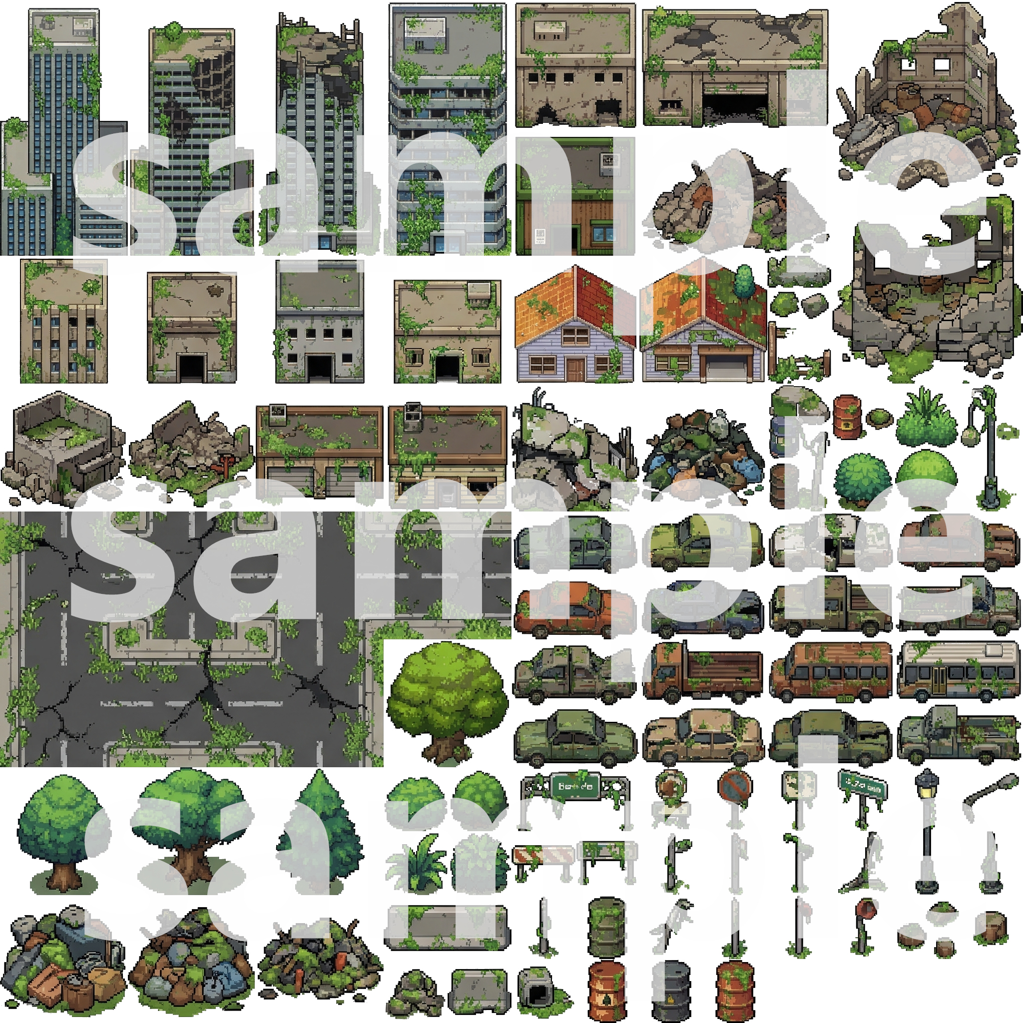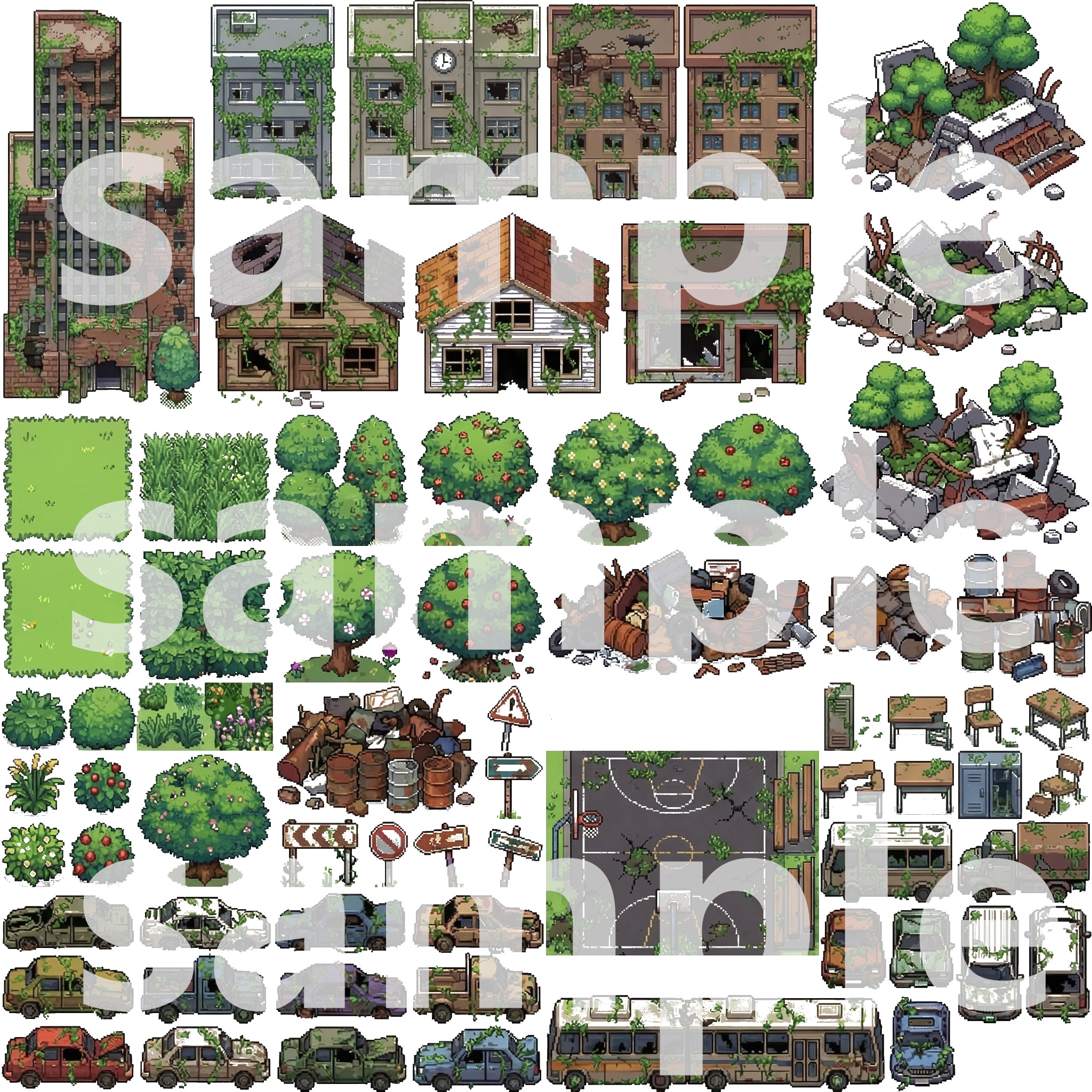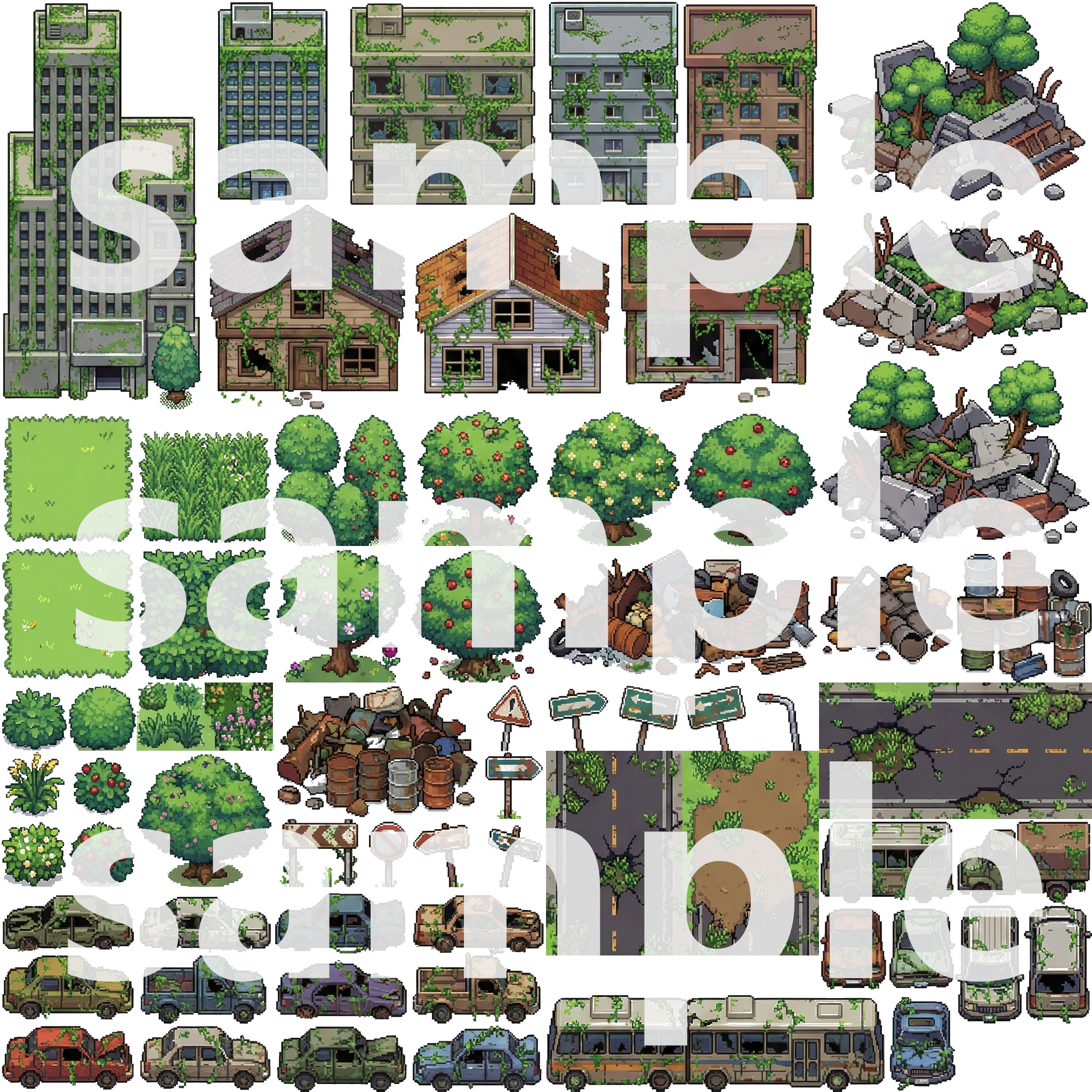 Buildings/โ Overgrown skyscrapers, houses, and ruinsNature/โ Trees, plants, grass, and ground tilesDebris/โ Cars, roads, garbage, and wreckageInterior/โ Abandoned furniture, appliances, and overgrown roomsProps/โ Signs, fences, skulls, and details