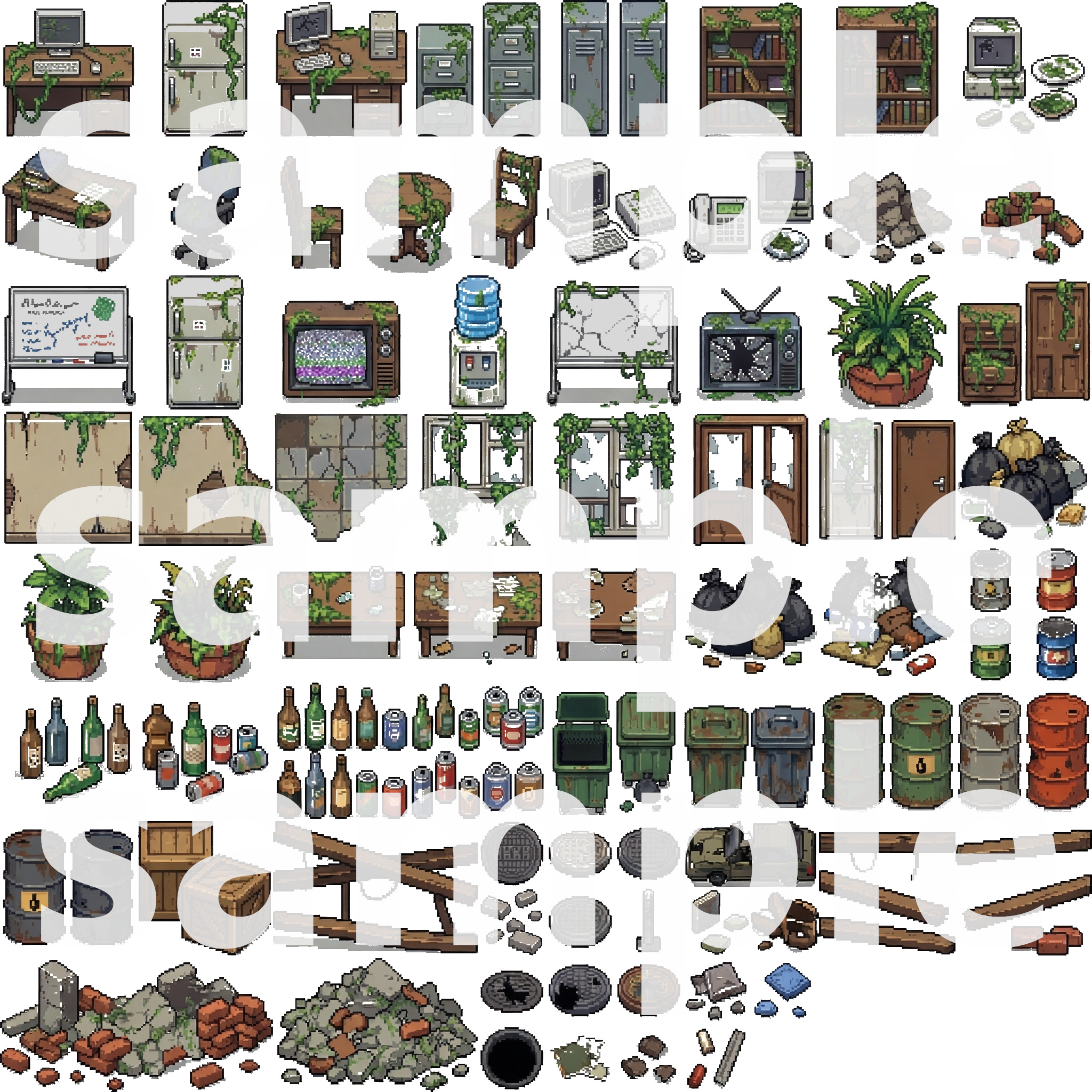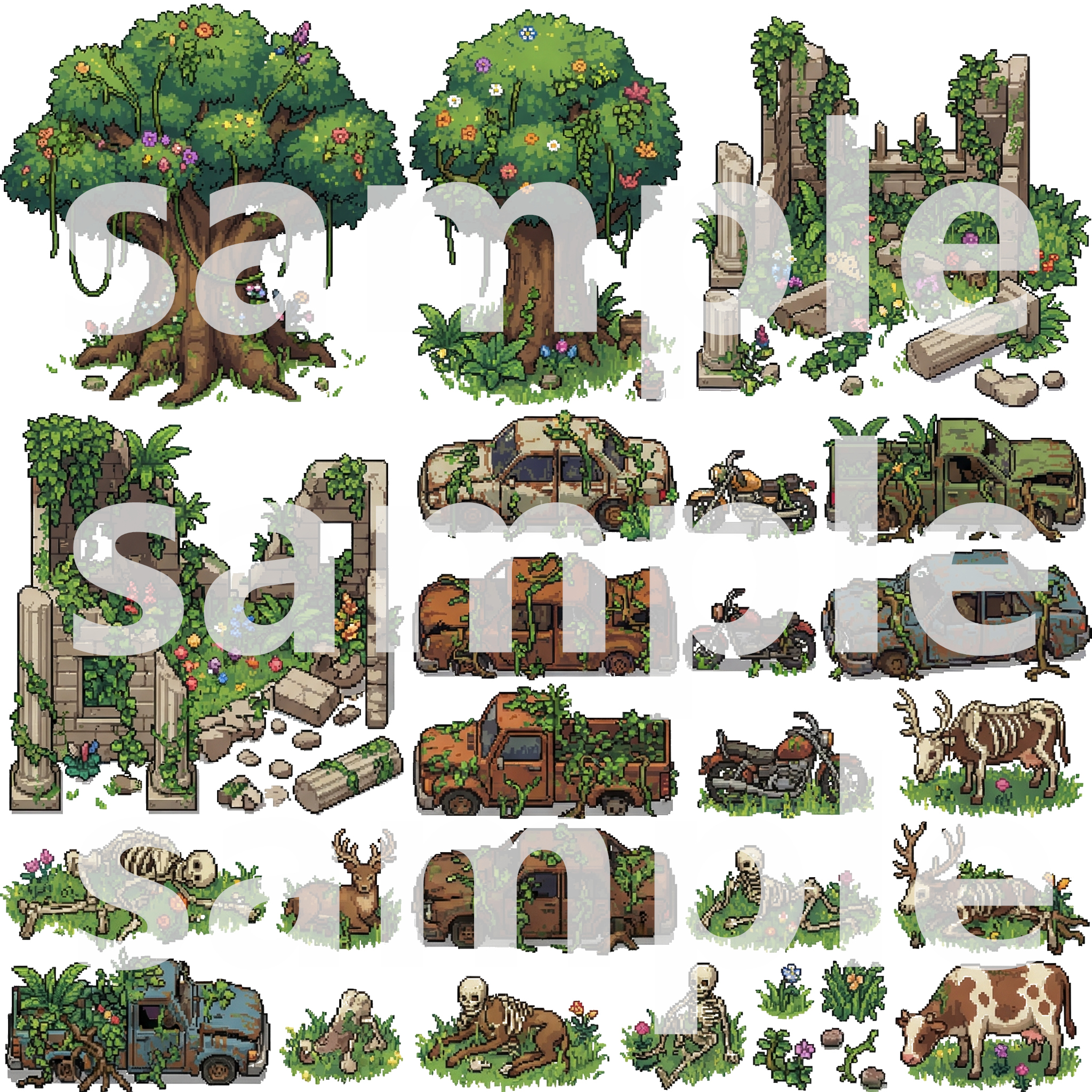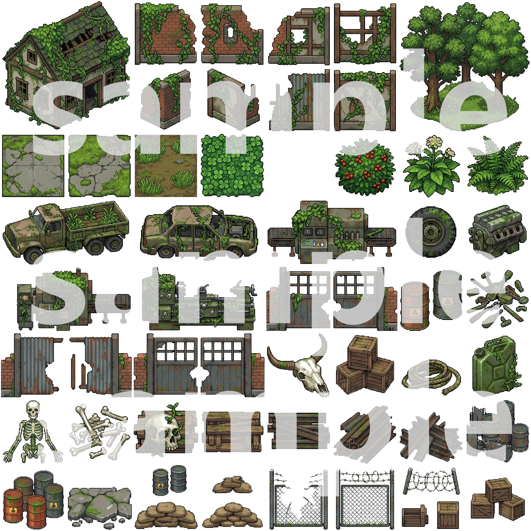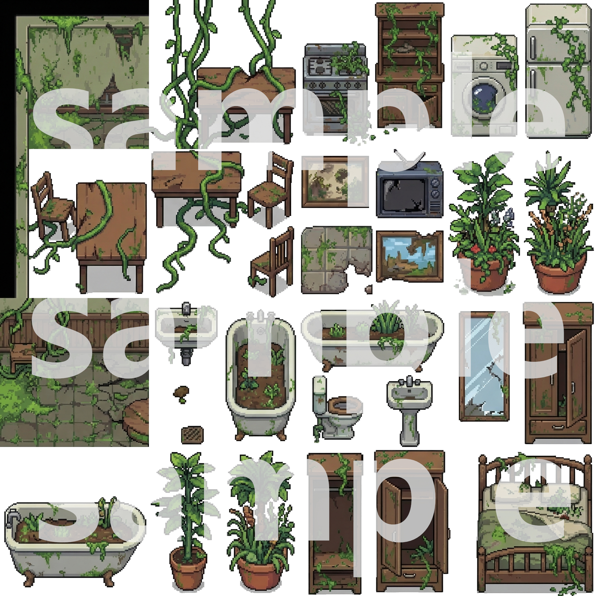 Buildings/โ Overgrown skyscrapers, houses, and ruinsNature/โ Trees, plants, grass, and ground tilesDebris/โ Cars, roads, garbage, and wreckageInterior/โ Abandoned furniture, appliances, and overgrown roomsProps/โ Signs, fences, skulls, and details