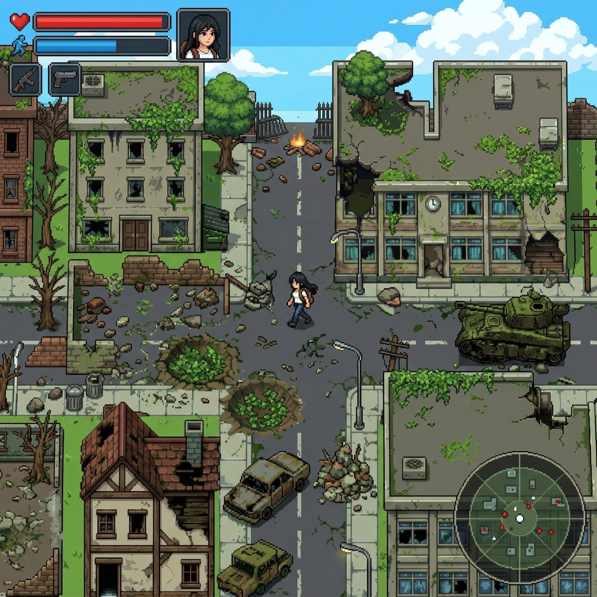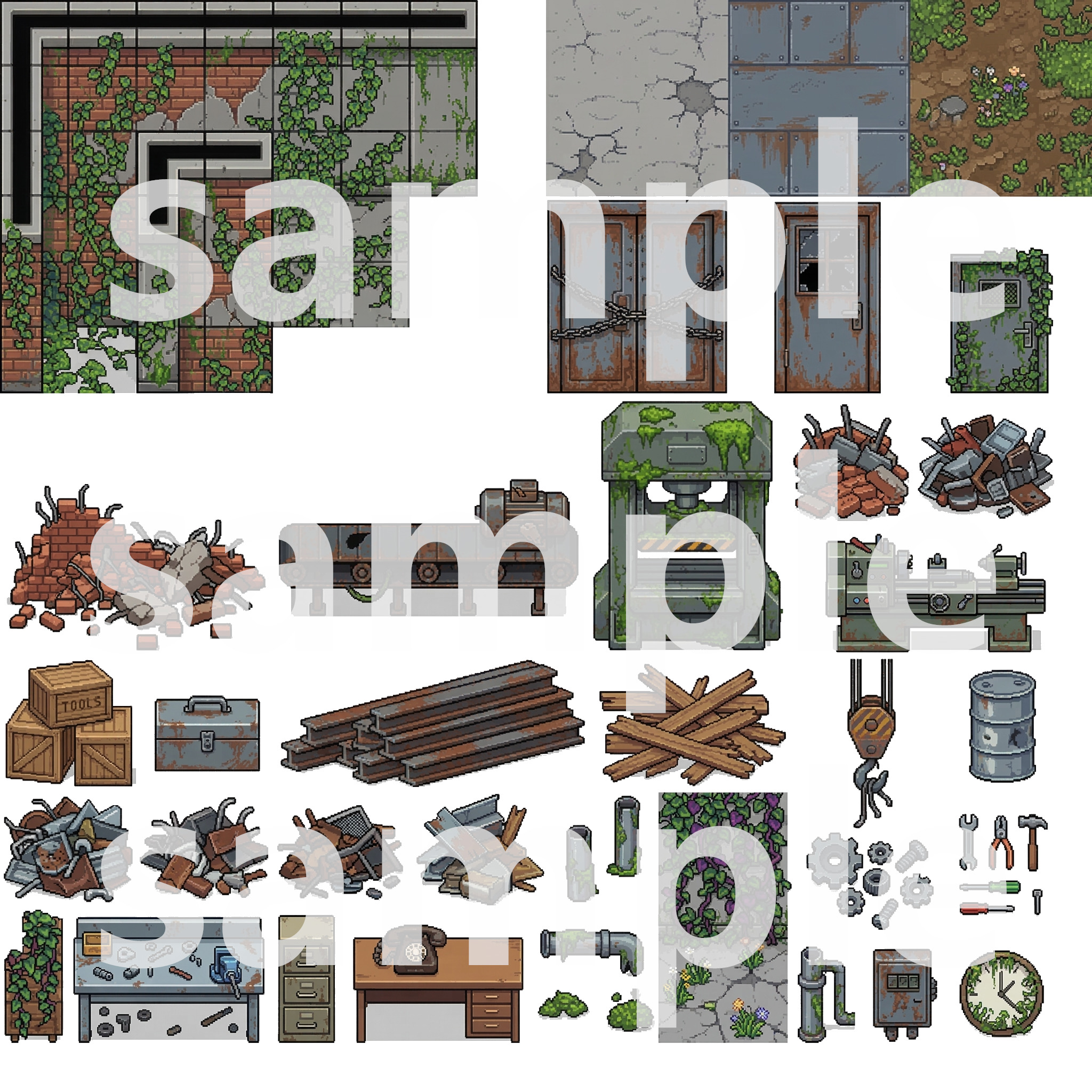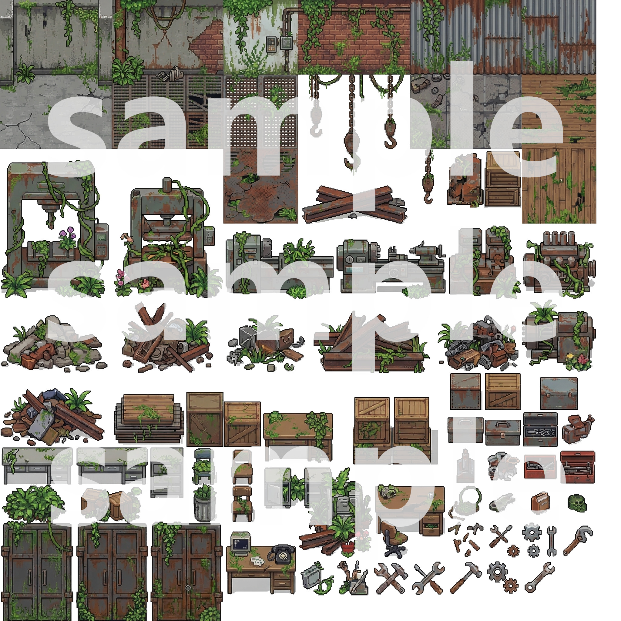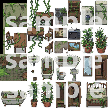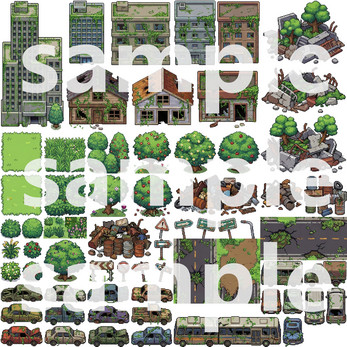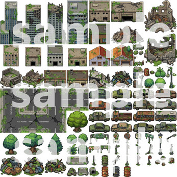 This tileset provides everything you need to build a detailed, atmospheric post-apocalyptic overgrown world for your 2D game (RPG, adventure, survival, or pixel art project).