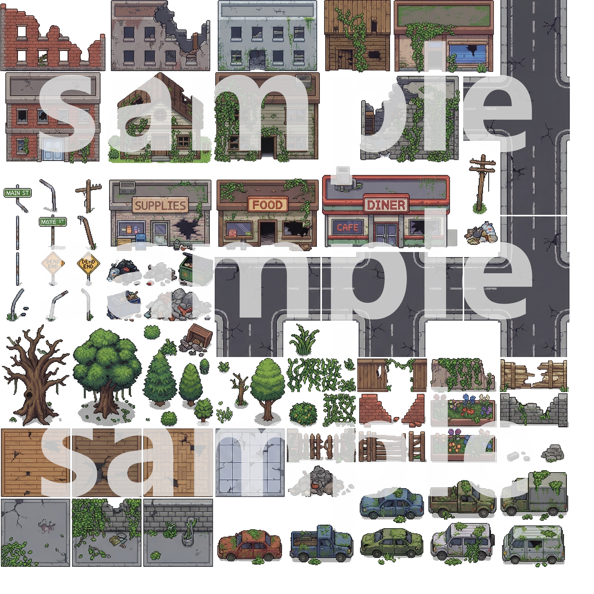 Buildings/– Overgrown skyscrapers, houses, and ruinsNature/– Trees, plants, grass, and ground tilesDebris/– Cars, roads, garbage, and wreckageInterior/– Abandoned furniture, appliances, and overgrown roomsProps/– Signs, fences, skulls, and details