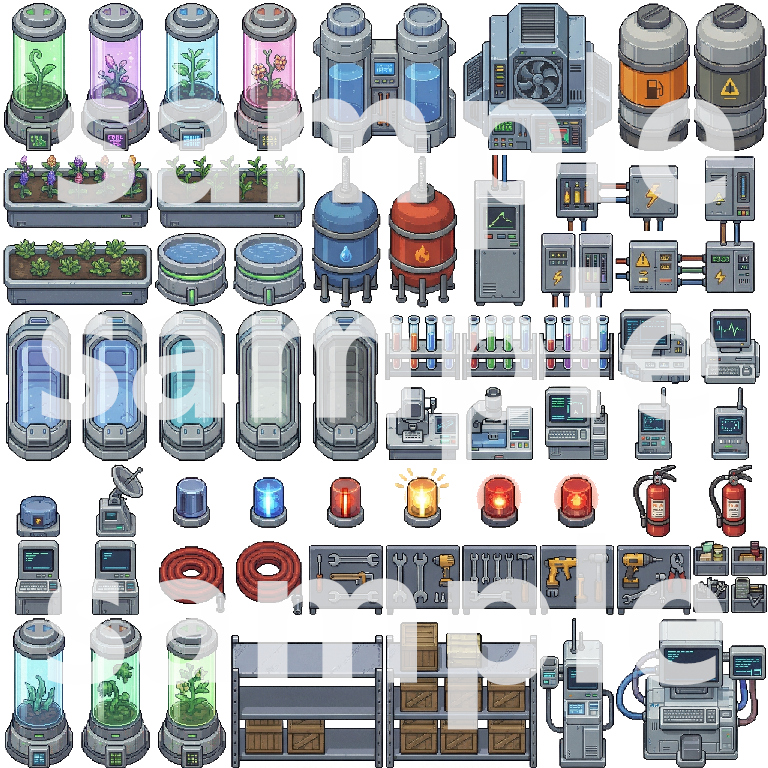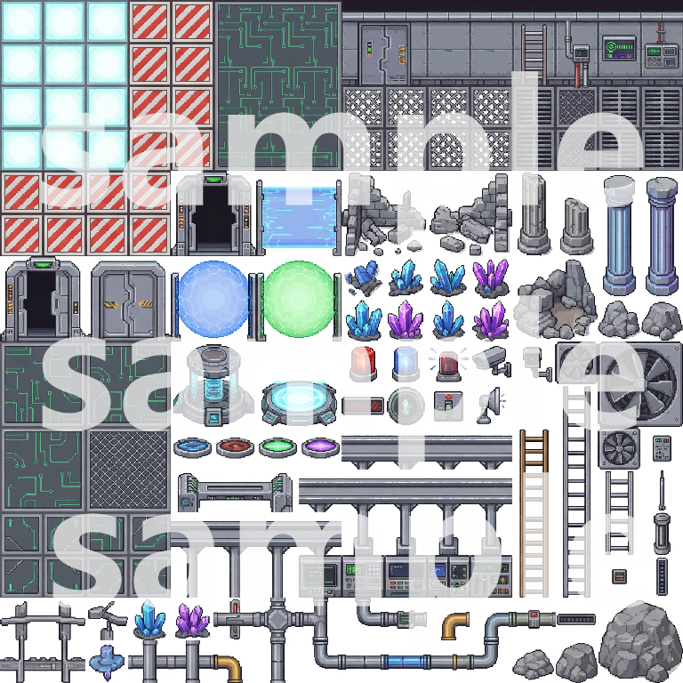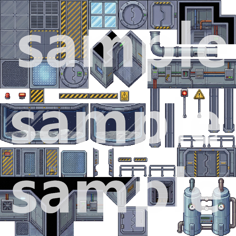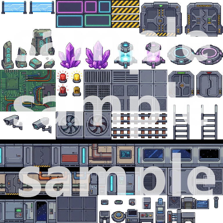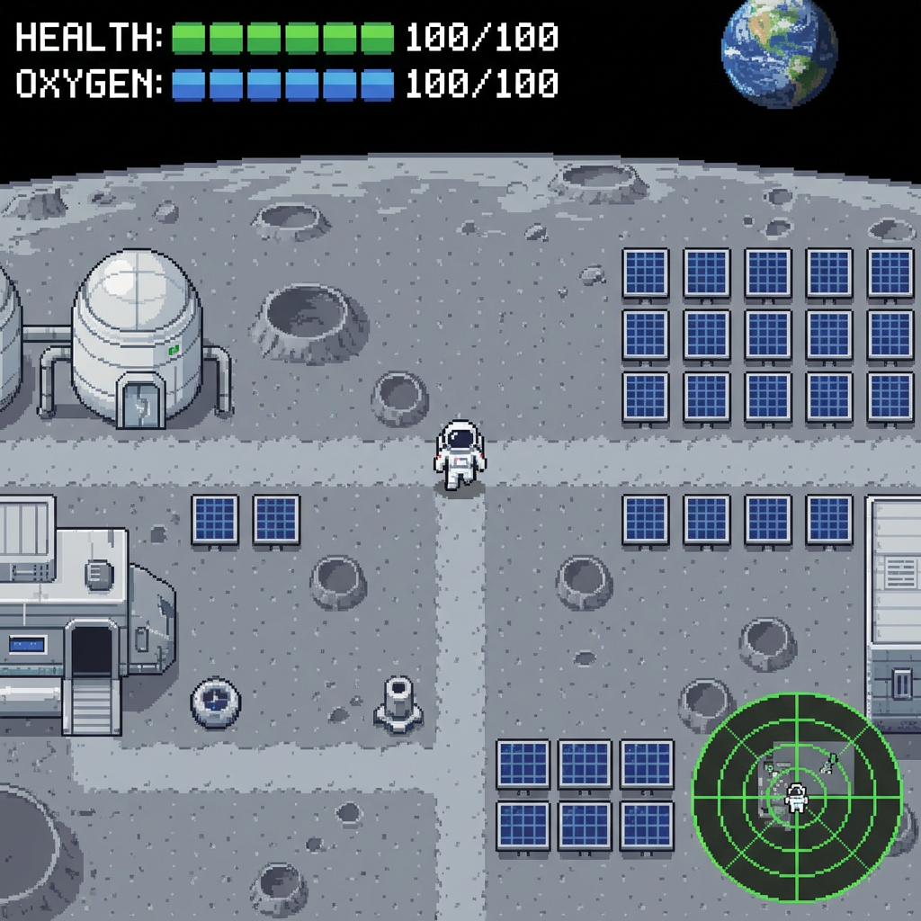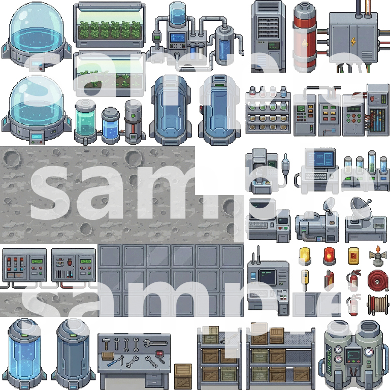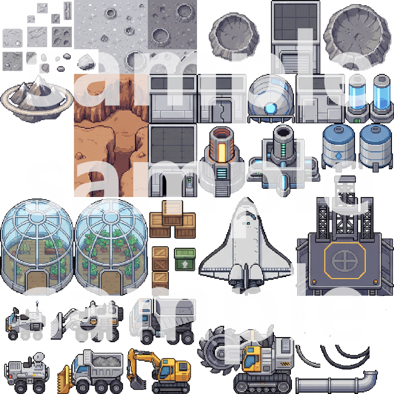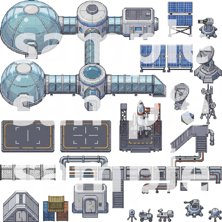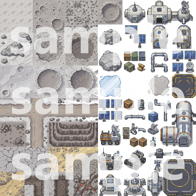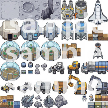 A comprehensive top-down pixel art tileset for building immersive lunar base and sci-fi game worlds. This pack includes everything needed to create detailed lunar surfaces, base exteriors, interiors, and functional facilities.