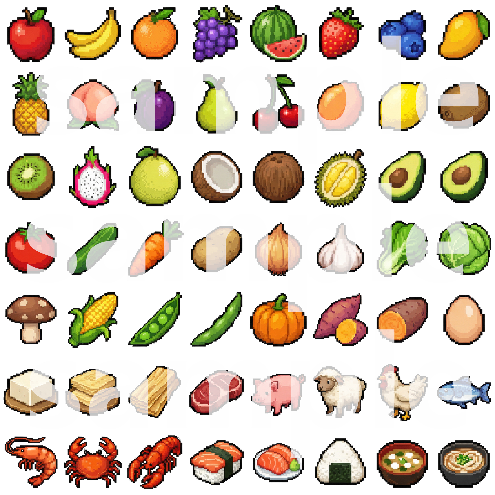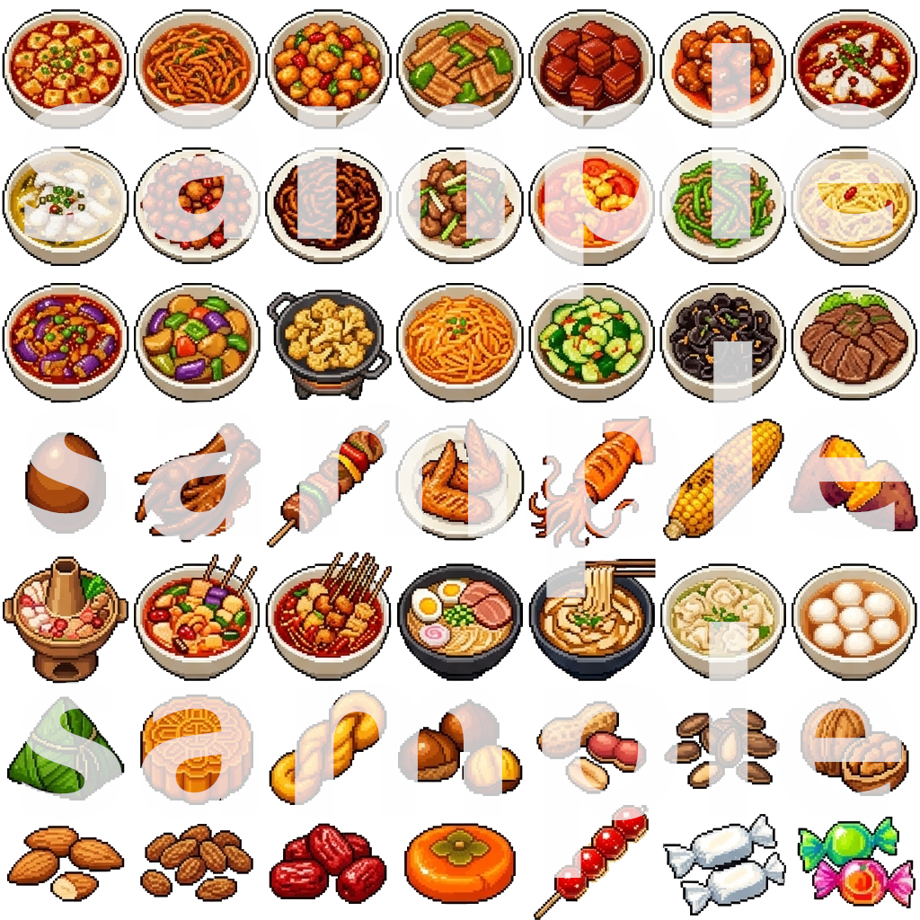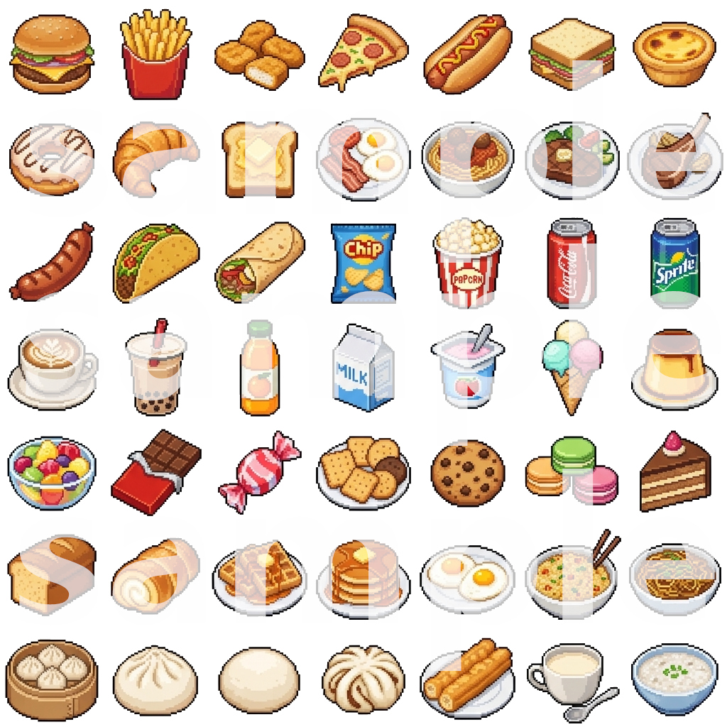This pack includes everything from fresh fruits & vegetables, fast food classics, Chinese & Western dishes, to snacks, drinks, and desserts. All icons are designed in a consistent, vibrant pixel style, ready to use in RPG Maker, Unity, Godot, and all major 2D game engines.