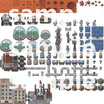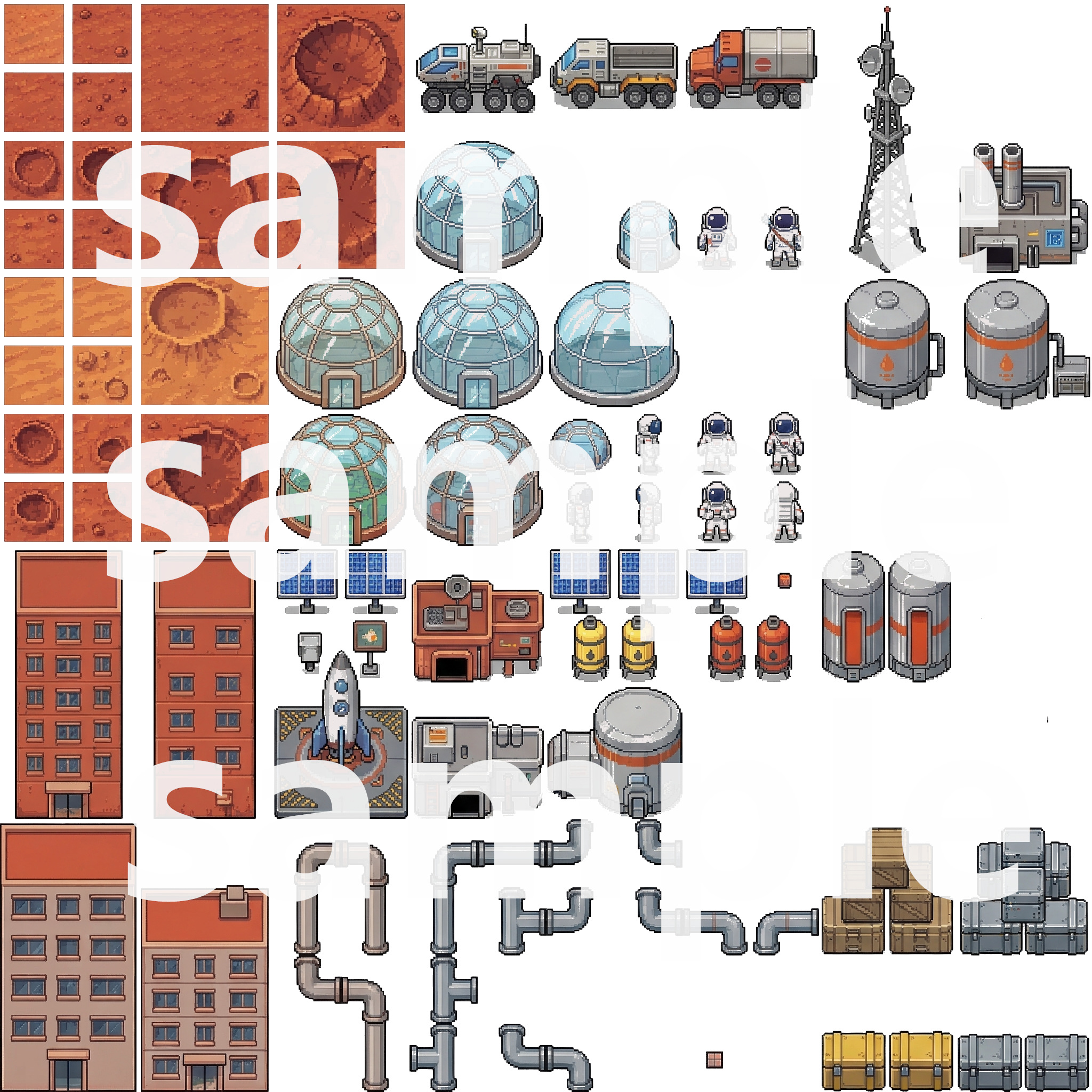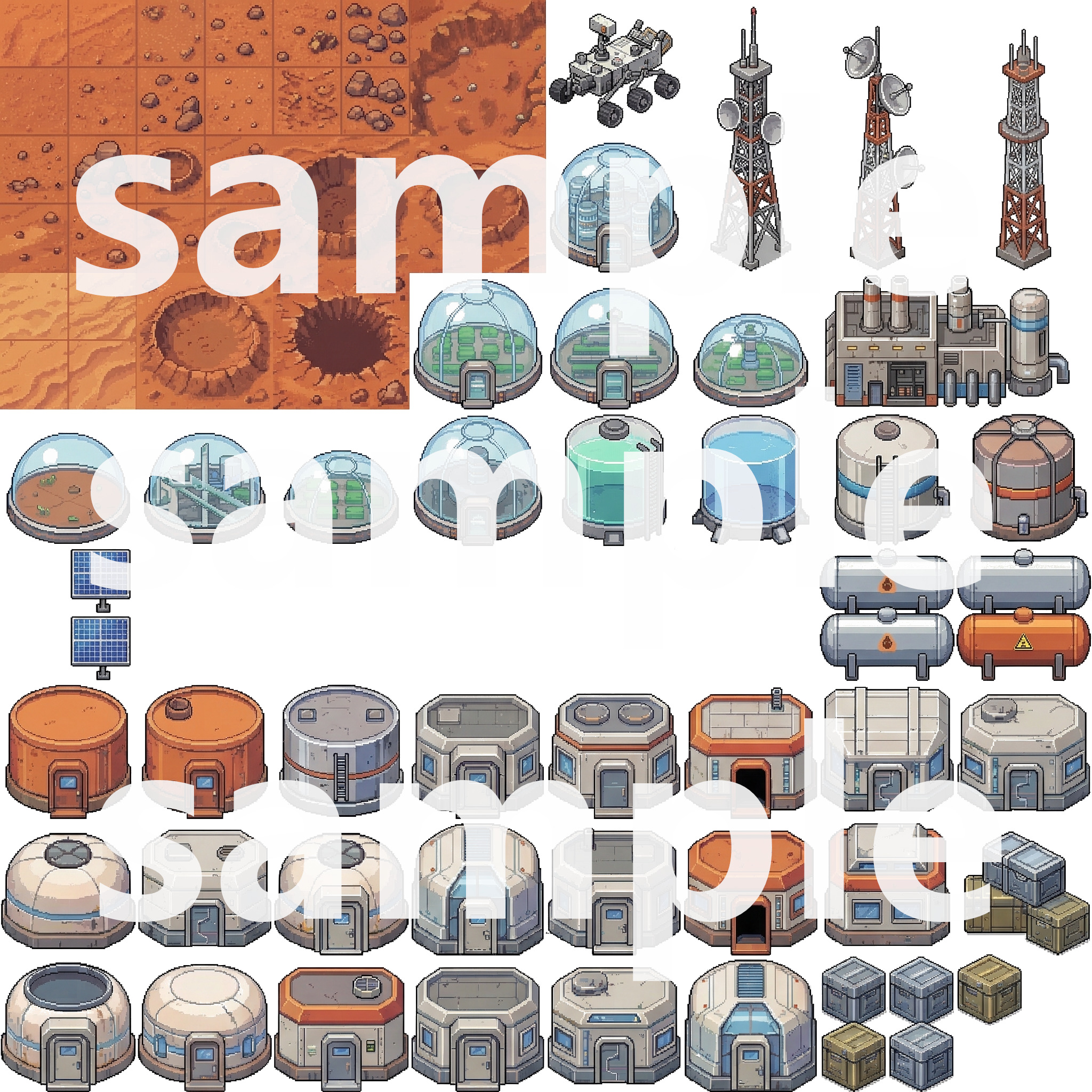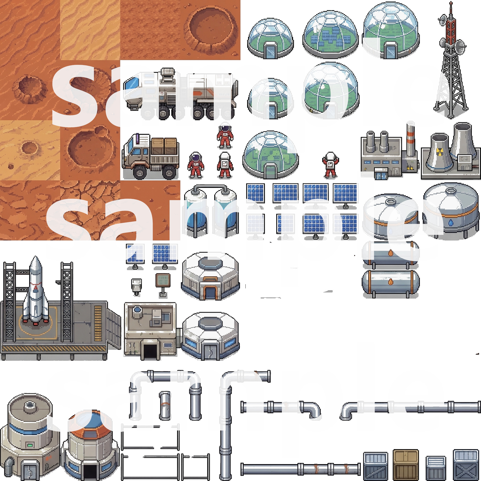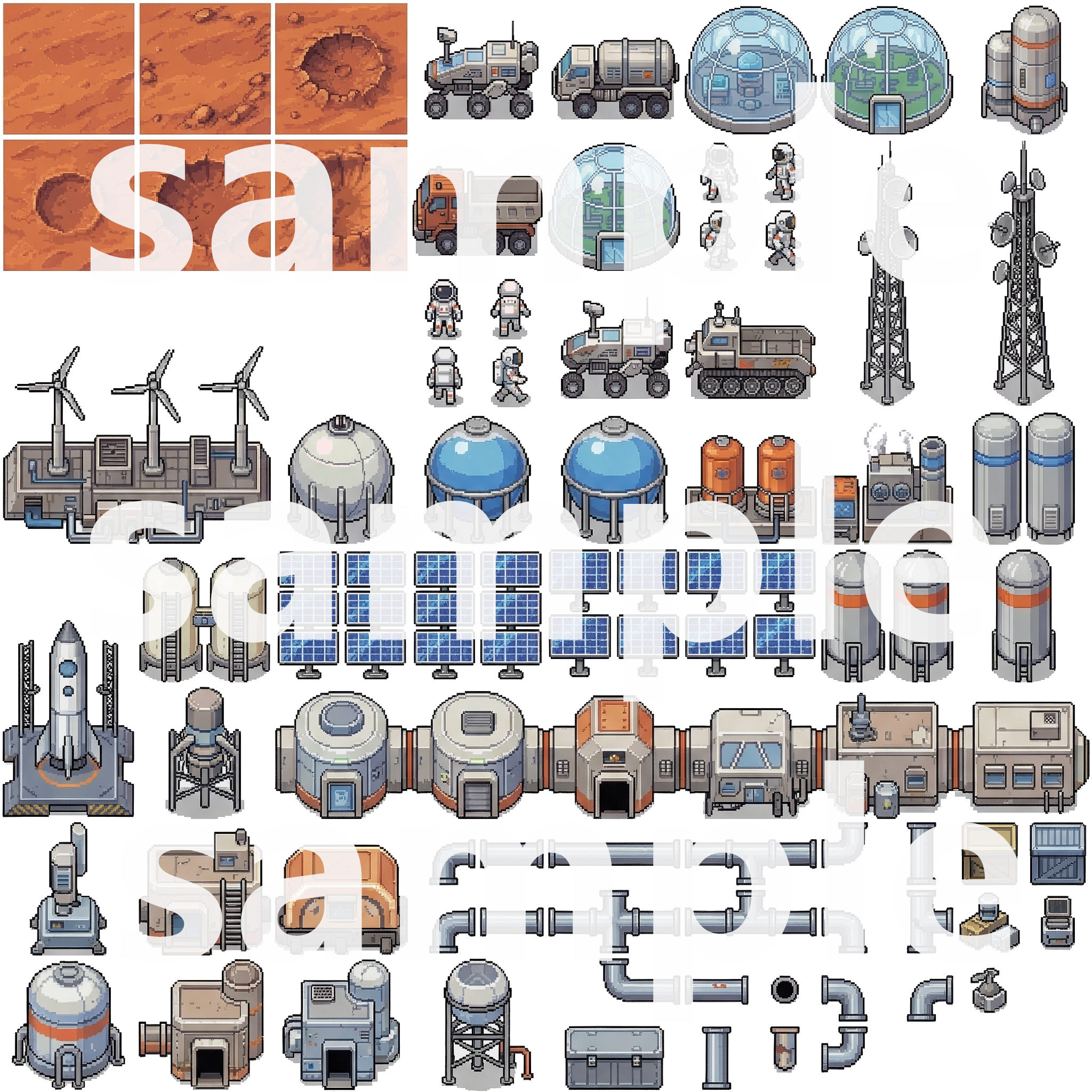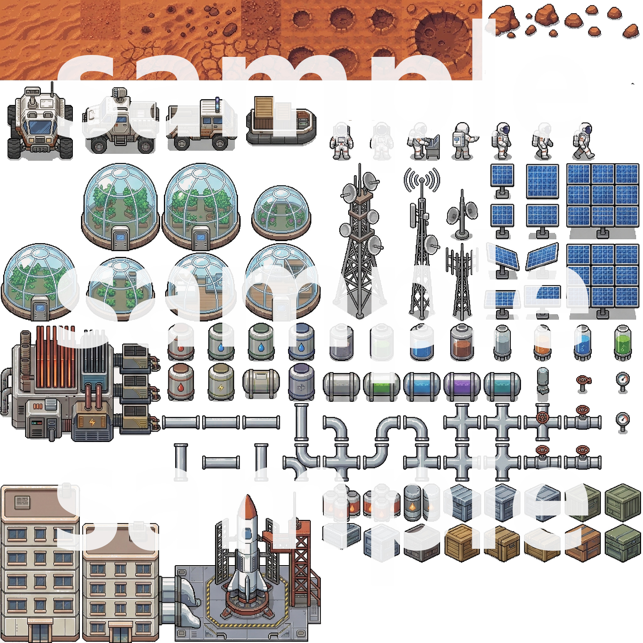 Terrain/โ Red Mars ground, craters, and rocky tilesStructures/โ Domes, base buildings, and labsVehicles/โ Rovers, trucks, rockets, and towersIndustrial/โ Pipes, tanks, factories, and storage