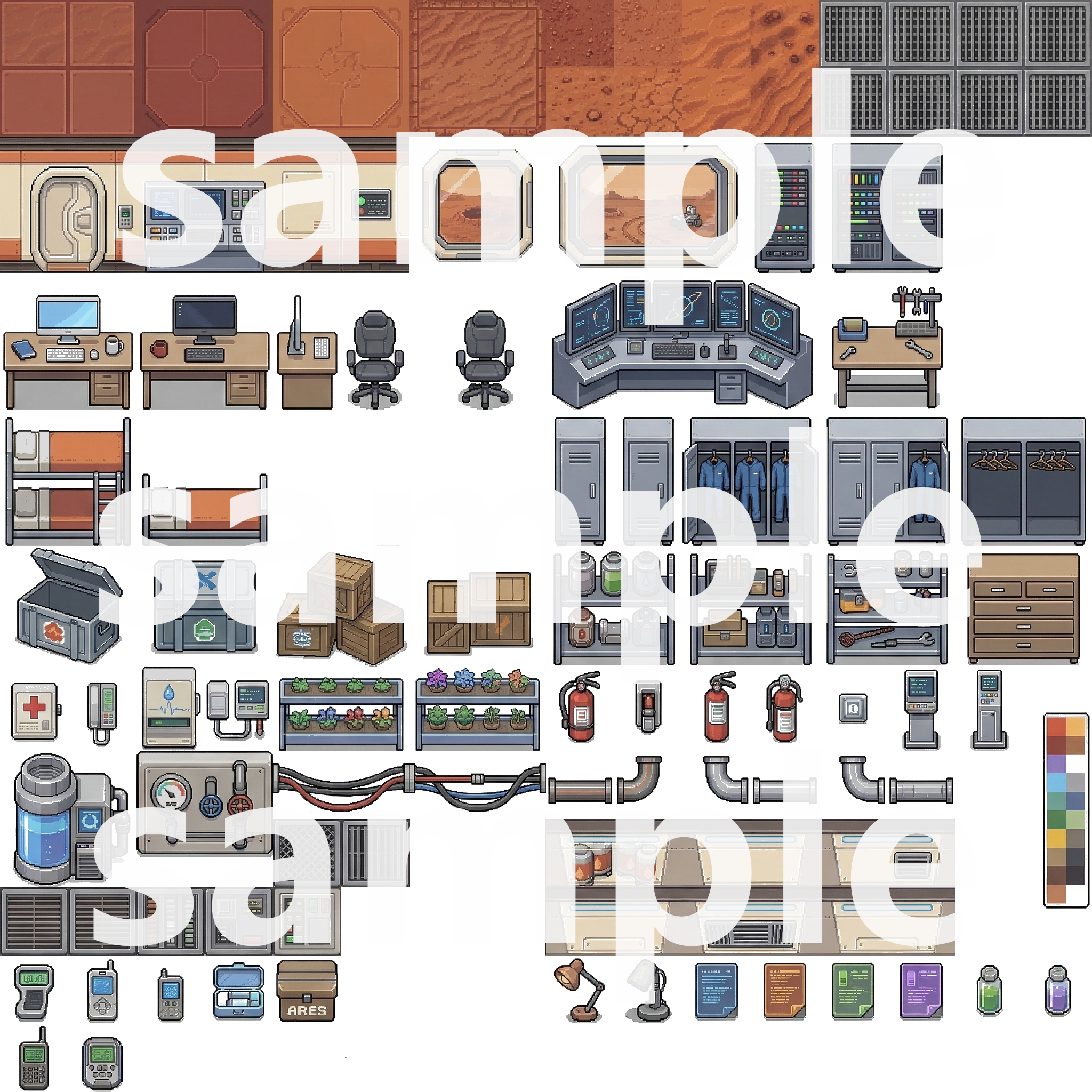 This tileset provides everything you need to build a fully functional, atmospheric Mars colony for your 2D sci-fi game (survival, strategy, RPG, or adventure).