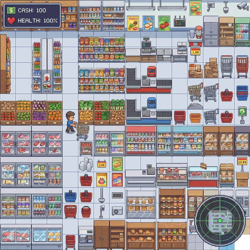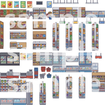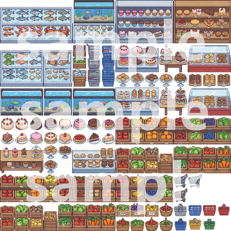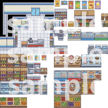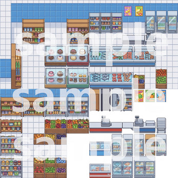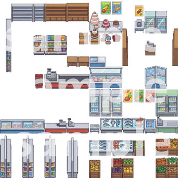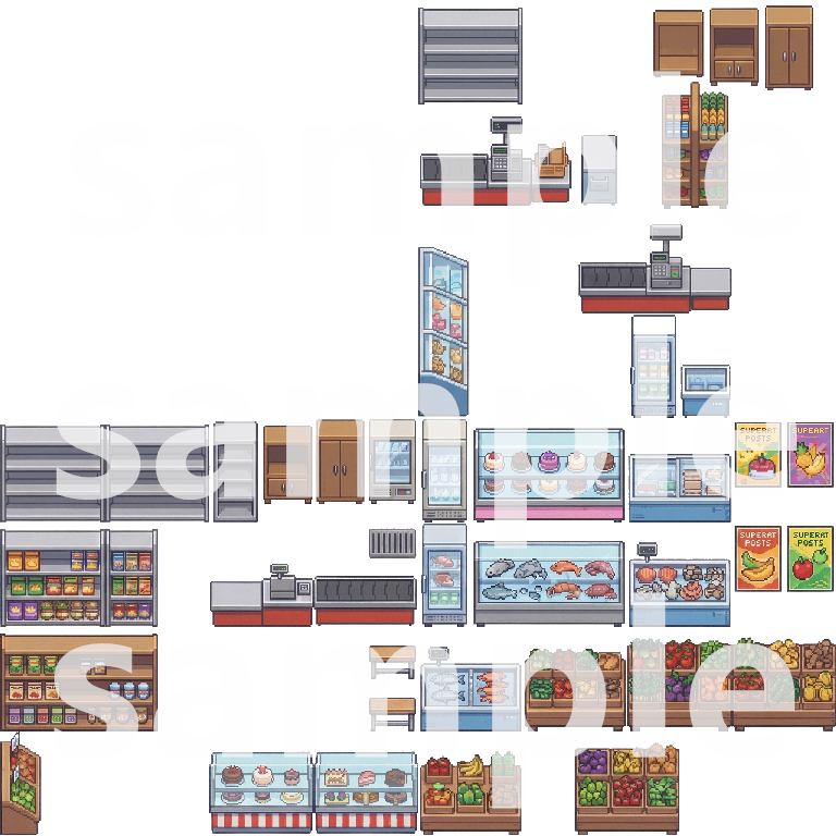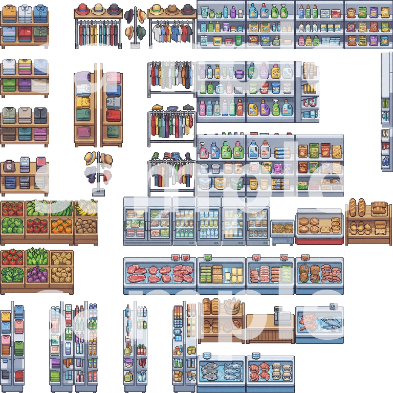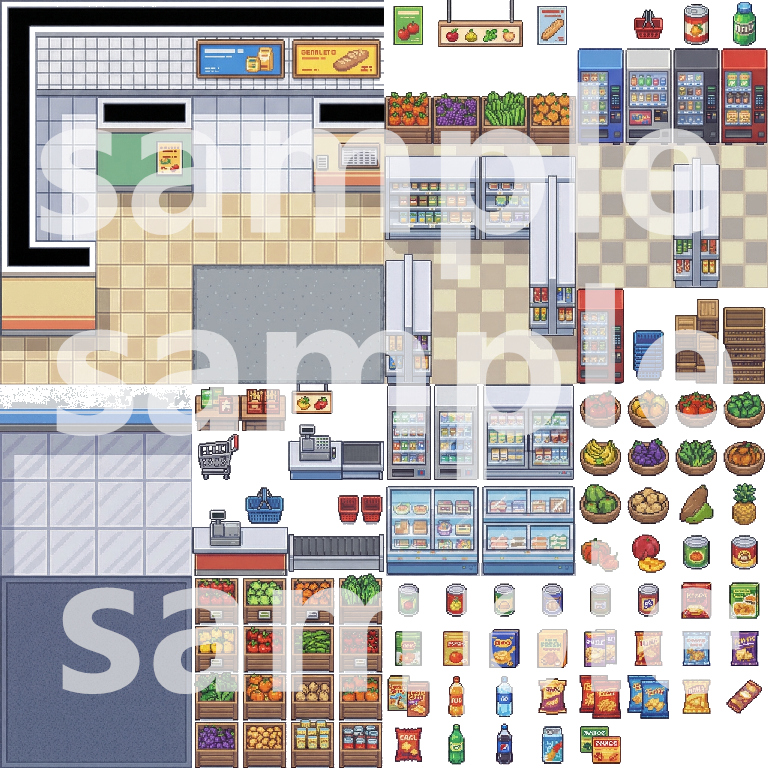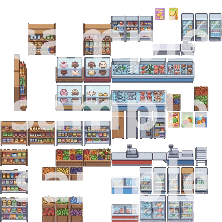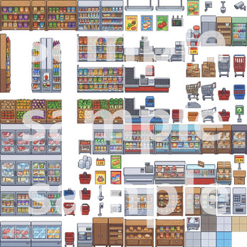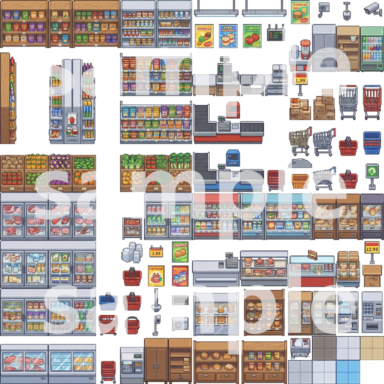 A versatile pixel art tileset for building cozy, detailed supermarket environments in your indie games.